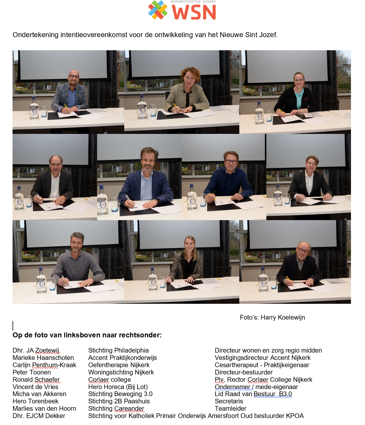 Vorige week is een mooie mijlpaal bereikt. 13 samenwerkende organisaties*, onder wie WSN, tekenden de intentieovereenkomst voor de ontwikkeling van het Nieuwe Sint Jozef. Er komt tegenover de binnenstad niet alleen een nieuw gebouw met appartementen voor ouderen en mensen met een zorgvraag, er wordt ook invulling gegeven aan ‘wonen met een plus’. Naast de juiste zorg voor de ouderen biedt het Nieuwe Sint Jozef straks verschillende maatschappelijke voorzieningen waar iedere Nijkerker gebruik van kan maken. Met het tekenen van deze overeenkomst wordt er een belangrijke stap gezet naar de volgende fase.