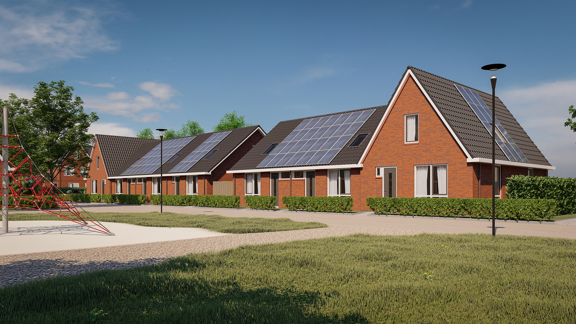 • De woningen zijn gasloos opgeleverd en zijn voorzien van een bodemwarmtepomp, mechanische ventilatiesysteem met warmteterugwinning en zonnepanelen.